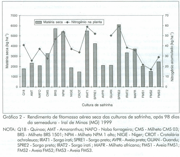 Um ensaio demonstrativo de 16 culturas semeadas a lanço, sem adubação, visando avaliara produção de matéria seca, foi realizado por Lara Cabezas et a!. (2000). Os resultados da avaliação, efetuada aos 98 dias após a semeadura, podem ser observados no Gráfico 2. A reciclagem de N correspondente está sumarizada no Quadro 1.