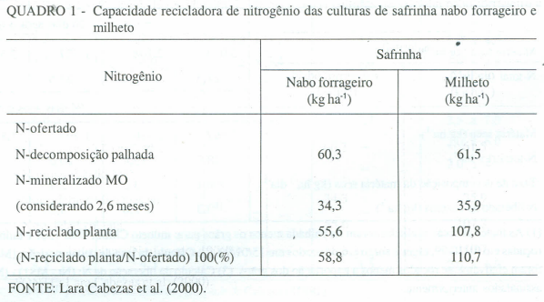 Tais resultados permitiram, de forma preliminar, classificar as culturas em baixa, média e alta produção de matéria seca (Quadro 2), em relação à reciclagem de N correspondente. O milheto BRS 1501, milheto NPM 1 e o sorgo preto apresentaram as maiores produções de matéria seca e recuperação de N acima de 30 kg ha'.