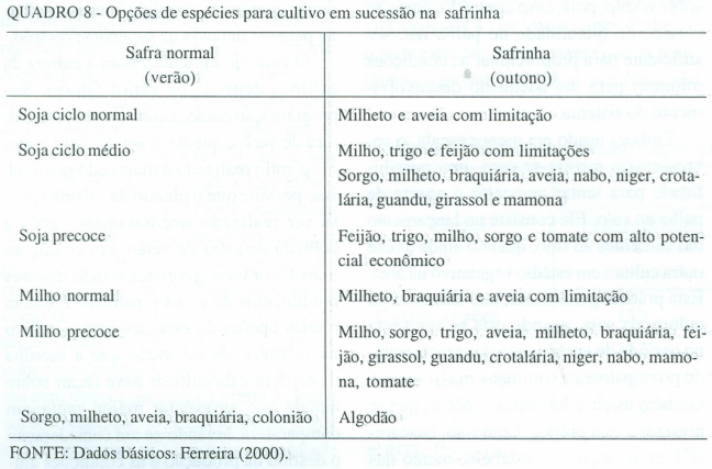 O êxito do agricultor com a cultura da safrinha depende de vários fatores. Sua programação começa com a escolha da cultura de verão, que deve ser de ciclo curto, e o plantio realizado o mais cedo possível. Isso permite que o plantio da safrinha possa ser realizado imediatamente após a colheita da safra de verão, em condições mais favoráveis, proporcionando maiores rendimentos de grãos e palhada. Existem muitas opções de espécies para o cultivo na safrinha, de tal modo que a escolha da espécie e da cultivar deve recair sobre aquela que apresentar maior vantagem comparativa, levando-se em consideração o destino da produção e as condições ambientais para a sua produção. O Quadro 8 mostra uma série dessas possibilidades. A Embrapa Cerrados tem avaliado diferentes alternativas como culturas de cobertura e tem obtido resultados promissores com o amarantus e com a quinoa (Chenopodium quinoai (Spehar e Teixeira, 2000 e Spehar et aI., 2000).