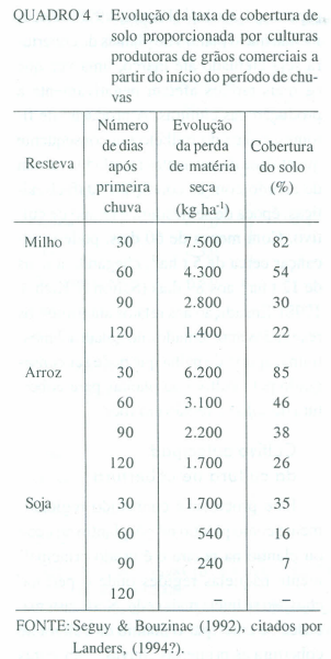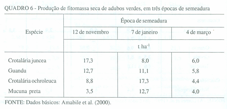 Alguns trabalhos desenvolvidos em Uberlândia (MG), região de cerrado do Triângulo Mineiro, ilustram o comportamento de plantas de cobertura, conforme a época de suas implantações. Resende (1995) avaliou a produção de matéria seca de três gramíneas (milheto, sorgo forrageiro e aveia preta) e três leguminosas (feijãoguandu, lab-lab e trernoço-azul) semeadas em fevereiro, março e abril, em Latossolo Vermelho argiloso. Verificou uma queda significativa na produção de matéria seca, em direta relação com a época mais tardia da semeadura, de tal forma que houve problemas de germinação, quando as culturas foram semeadas em abril. Na semeadura de fevereiro foram destaque, o sorgo forrageiro entre as gramíneas, produzindo 16,7 t ha' de matéria seca e o feijão-guandu entre as leguminosas, produzindo 4,26 t ha' de matéria seca. Neste mesmo local, foram obtidas as seguintes produções médias de matéria seca para as culturas de aveia preta,feijão-guandu, milheto, nabo forrageiro, sorgo forrageiro e lab-lab: 3,96; 0,82; 5,84; 5,06; 6,44 e 1,32 t ha', respectivamente, com predomínio da produção de matéria seca das gramíneas em relação às leguminosas. Fontes (1998) comparou a produção de matéria seca de três variedades de feijão-guandu; lab-lab; crotalária spectabilis é nabo forrageiro em duas épocas (março e abril), com destaque para o nabo forrageiro na primeira época (produção de 3,9 t ha'), e para as leguminosas com produção inferior a 3,0 t ha'. Em média, as culturas semeadas em abri I alcanç_aram produções de matéria seca inferiores a 0,5 t ha'. Isto coloca em evidência a grande dificuldade na formação de palhada para o SPD, ainda com semeaduras efetuadas na segunda quinzena de março na região.