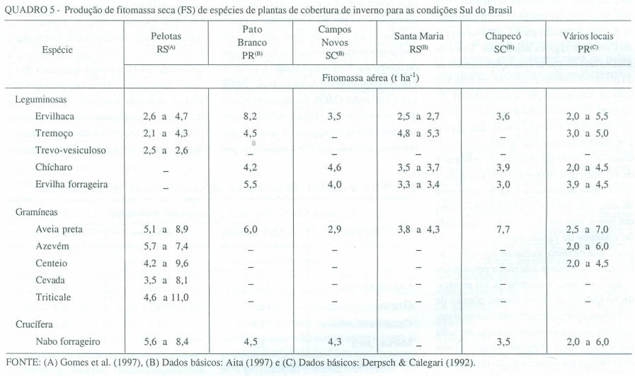 A Região Sul caracteriza-se por possuir um inverno úmido, no qual é possível implantar culturas adaptadas a essa condição, de forma que há alternativas diversificadas de sistemas de produção em que as culturas principais, produtoras em especial de grãos, são estabelecidas na primavera-verão e, no outono-inverno, faz-se o cultivo de plantas (cereais) produtoras de grãos, como é o caso do trigo ou de plantas de adubação verde para cobertura do solo. Exemplos da produção de fitomassa das principais espécies usadas no inverno para a produção de palhada são mostrados no Quadro 5. Verifica-se que existe uma grande variação na produção de fitomassa entre espécies para um mesmo local e também entre locais para uma mesma espécie. Essas variações são esperadas, conforme já foi mencionado, devido às condições de adaptação de cada uma delas às variações do ambiente, da época de plantio, do solo e do manejo adotado. Existe também a possibilidade de cultivar espécies na primavera-verão, necessitando para isso alterar o sistema de cultivos. Nessa época, há bons rendimentos de fitomassa, conforme relatado por Ceretta et ai. (1994), que obtiveram para algumas espécies de plantas de cobertura, plantadas em setembro, em Santa Maria (RS), as seguintes produções de fitomassa: feijão-de-porco 6,1 t ha': crotalária spectabilis 5,3 t ha': guandu-anão 5,6 t ha' e vegetação espontânea 3,8 t ha'. O feijão-de-porco foi a leguminosa que se destacou, pois permitiu um rendimento de grãos de milho em sucessão equivalente ao obtido com a aplicação de 130kg ha' de N na presença da fitomassa das espontâneas. Outra opção é o milheto que, segundo Salton & Kichel (1998), na região abaixo de São Paulo e Sul do MS, pode ser semeado na primavera, com ocorrência das primeiras chuvas ou no outono, após a colheita da cultura de verão. Salientam ainda que nesta região é preferível o cultivo da aveia no outono, devido à ocorrência de geadas e maior produção de massa. Existe ainda em algumas áreas do país (PR, SP, GO, MT, MS e MG) o cultivo de uma segunda safra comercial denominada safrinha. A safrinha é plantada predominantemente com milho (na safra de 2000 foram plantados cerca de 2.500.000 ha deste cereal), sorgo, milheto e girassol. Nesta situação, o cultivo das plantas de cobertura, se ainda for necessário, é feito após a colheita da safrinha numa condição menos propícia. Muitas vezes o cultivo dessas plantas não é executado nestas condições.