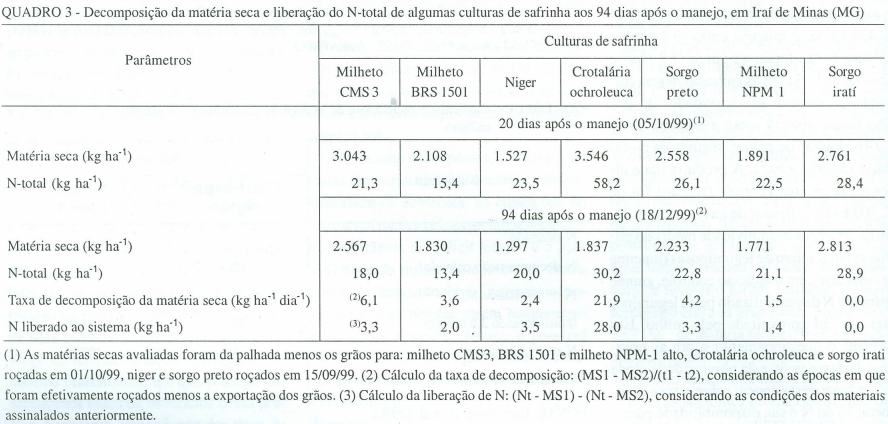 No Quadro 3, pode-se observar a taxa de decomposição da matéria seca e o correspondente N liberado de algumas das culturas 94 dias após ter efetuado o manejo. Para as gramíneas (milhetos e sorgo) pode-se notar que as taxas de decomposição da matéria seca variaram de 0,0 até 6,1 kg ha' dia-I, com uma reduzida liberação do N reciclado. Cabe destacar a taxa de decomposição da crotalária ochroleuca (21,9 kg ha' dia-I), representando uma liberação de 28,0 kg ha' de N reciclado durante o período avaliado, como seria esperado pela característica do material.