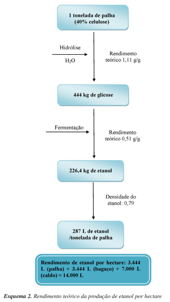 A produtividade média de cana-de-açúcar no Brasil é de 85 toneladas por hectare, sendo que para cada tonelada de cana processada são gerados cerca de 140 kg de palha e 140 kg de bagaço em base seca, ou seja, 12 toneladas de palha e 12 toneladas de bagaço.25 Considerando que toda glicose vai ser convertida em etanol, o aproveitamento integral da cana-de-açúcar (colmo, palha e bagaço) poderá aumentar significativamente a produção de etanol por hectare, passando dos atuais 7.000 L para aproximadamente 14.000 L, sem necessidade de expansão da área cultivada26-28 (Esquema 2). A palha de cana-de-açúcar representa 15% do peso dos colmos da cana madura, ou 12% quando seca.13,29 Em termos energéticos a palha representa 1/3 da energia potencial da cana-de-açúcar que, atualmente, é subaproveitada.