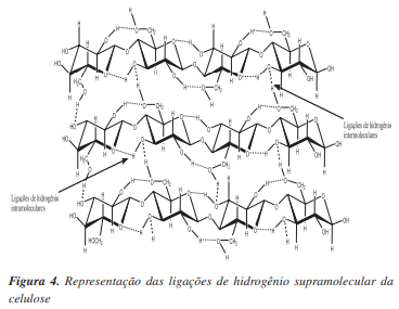 As ligações de hidrogênio intramoleculares entre as hidroxilas conferem resistência à celulose. Já as interações intermoleculares entre hidroxilas são responsáveis pela formação da fibra vegetal, onde de seis a oito moléculas de celulose se alinham paralelamente para formar uma fibra, eliminando as moléculas de água, tornando a microfibrila extremamente longa e resistente (Figura 4). Sobre a superfície das microfibrilas, aderem-se as hemiceluloses que cobrem a celulose, formando o chamado domínio celulose-hemicelulose da parede celular.