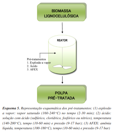 Dentre estas técnicas de pré-tratamento da biomassa lignocelulósica, pode-se destacar a explosão a vapor, AFEX e utilização de ácido diluído como os métodos mais estudados e promissores no processo de obtenção de etanol a partir da biomassa lignocelulósica46 (Esquema 5).