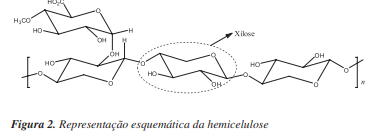 As hemiceluloses são heteropolissacarídeos complexos compostos por D-glucose, D-galactose, D-manose, D-xilose, L-arabinose, ácido D-glucurônico e ácido 4-O-metil-glucurônico (Figura 2). São estruturalmente mais semelhantes à celulose do que a lignina. Sua estrutura apresenta ramificações que interagem facilmente com a celulose, dando estabilidade e flexibilidade ao agregado.20 Comparadas com a celulose, as hemiceluloses apresentam maior susceptibilidade à hidrólise ácida, pois oferecem uma maior acessibilidade aos ácidos minerais comumente utilizados como catalisadores. Esta reatividade é usualmente atribuída ao caráter amorfo destes polissacarídeos.