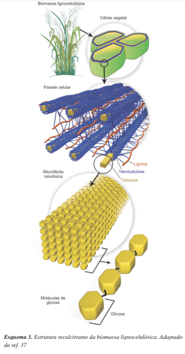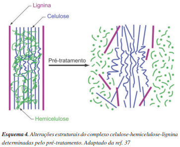 A relação entre a característica da estrutura da celulose e as taxas de hidrólise enzimática tem sido extensivamente estudada, mas ainda não existe tecnologia hidrolítica que seja economicamente viável e sustentável. Tais características, como cristalinidade da celulose, área superficial específica, grau de polimerização, proteção da celulose pela lignina e hemicelulose, são consideradas fatores que interferem na eficiência de hidrólise. A relação entre fatores estruturais reflete a complexidade da recalcitrância da biomassa lignocelulósica. A variabilidade dessas características explica o grau de digestibilidade enzimática entre diferentes fontes de biomassa.6 Sendo assim, a utilização dos diferentes componentes passíveis de serem obtidos a partir de biomassa lignocelulósica requer a separação seletiva dos mesmos. Isto implica na ruptura do complexo celulose- -hemicelulose-lignina e na remoção de cada fração por técnicas de pré-tratamento para degradação enzimática (Esquema 4). Vários métodos de pré-tratamentos têm sido propostos e desenvolvidos. Esses métodos podem ser classificados de diferentes formas, pré- -tratamentos físicos, químicos, biológicos ou uma combinação destes no intuito de reduzir a recalcitrância da biomassa lignocelulósica. Dentre estes métodos, os pré-tratamentos químicos e combinados têm recebido uma maior atenção, já que removem a lignina sem degradar a cadeia celulósica. Como a lignina está quimicamente ligada às hemiceluloses, uma degradação parcial das hemiceluloses ocorre no processo de pré-tratamento químico.