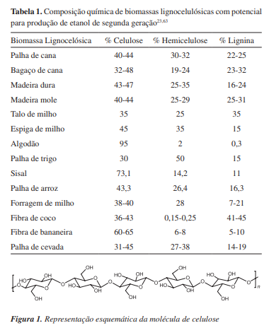 A biomassa lignocelulósica constitui a maior fonte de carboidratos naturais do mundo. A dificuldade de converter a biomassa lignocelulósica em insumos químicos é atribuída às suas características químicas e morfológicas. Esses materiais lignocelulósicos são constituídos de fibras de celulose envolvidas em uma matriz amorfa de polioses e lignina. Essa matriz amorfa age como uma barreira natural ao ataque de micro-organismos e/ou enzimas e torna esses materiais estruturalmente rígidos e pouco reativos. A composição química da biomassa lignocelulósica, geralmente contém 35-50% de celulose, seguido de 20-35% de hemicelulose, 10-25% de lignina e uma pequena quantidade de cinzas e extrativos. Esta composição química varia em função do tipo de biomassa, conforme mostrado na Tabela 1.