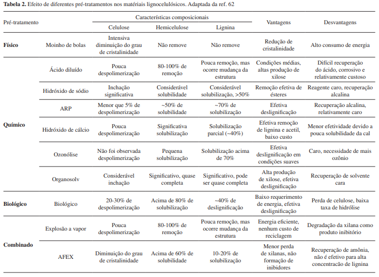 Várias revisões sobre pré-tratamento foram publicadas nos últimos anos. Na Tabela 2 são apresentados de forma simplificada os diferentes tipos de pré-tratamento pesquisados e as respectivas mudanças causadas à biomassa lignocelulósica.