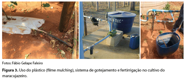 O uso de plástico (filme mulching) junto com o sistema de irrigação por gotejamento pode economizar muito a água necessária para a irrigação do maracujá (Figura 3).