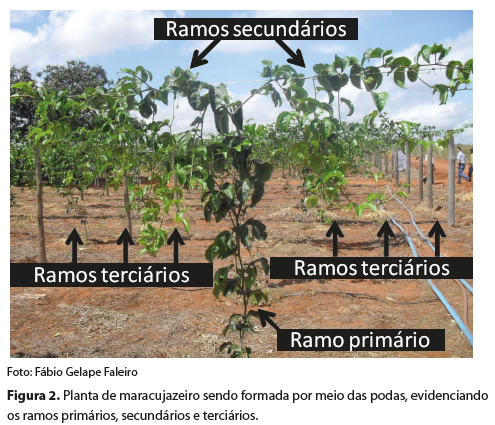 Nesse momento, os ramos secundários são podados novamente para formar as ramificações terciárias, essas, que são responsáveis pela grande parte da produção de flores e frutos. A Figura 2 ilustra os ramos primários, secundários e terciários de uma planta de maracujá conduzida em espaldeira.