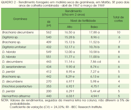 A resposta das pastagens à aplicação de nutrientes é tanto mais acentuada quanto maior for a exigência das gramíneas e a presença ou não de leguminosas. As braquiárias são consideradas plantas adaptadas a solos de baixa e média fertilidade, como demonstraram Buller et al. (1972), ao estudarem o comportamento de diversas gramíneas, aplicando altas doses de fertilizantes (200, 100 e 50 kg/ha), em relação a baixas doses (100, 25 e 0 kg/ha) de N, P e K, respectivamente. A avaliação da produção foi feita por meio de cortes, cujos resultados estão apresentados no Quadro 2.