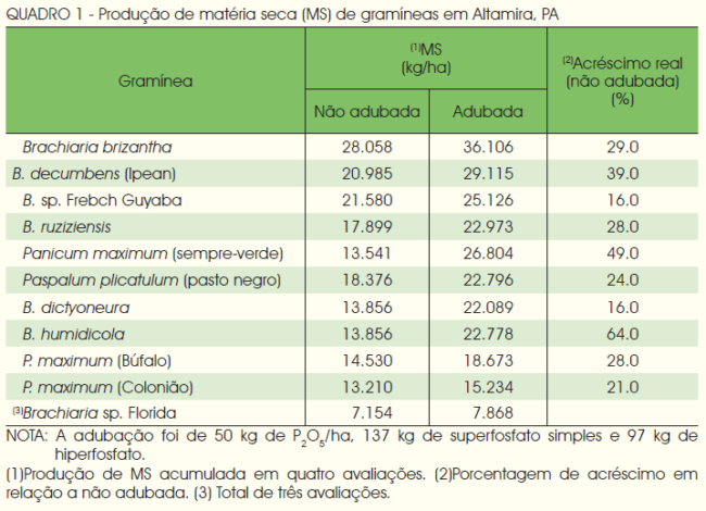 São inúmeros os trabalhos em que se estudam respostas das principais gramíneas e leguminosas à aplicação de diferentes doses e fontes de P, como foi desenvolvido por Azevedo e Souza (1982), em Altamira, PA (Quadro 1). Observa-se uma resposta acentuada de todas as gramíneas à adubação com P, exceto da Brachiaria sp. Florida.