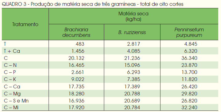 Serrão et al. (1971) estudaram as respostas de B. decumbens, B. ruziziensis e Penninsetum purpureum a diversos elementos fertilizantes em solo Latossólico representativo dos arredores de Belém e das regiões Bragatina e Guajarina, no estado do Pará, de baixa fertilidade, quando usaram os seguintes tratamentos: T = testemunha; T + Ca = T + calagem; C (completo: N, P, K, Ca, Mg, S e micronutrientes); C – N; C – P; C – K; C – Ca; C – Mg: C – S e Mn; C – Mi (micronutrientes: Cu, Zn, B e Mo). Somente o calcário, P e Mg foram aplicados no plantio. Os demais nutrientes foram aplicados em quatro parcelamentos iguais para as braquiárias e cinco para o capim elefante. Os resultados obtidos podem ser observados no Quadro 3.