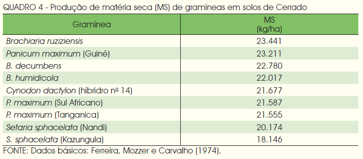 Ferreira, Mozzer e Carvalho (1974) mostraram que braquiárias, com a mesma adubação, produzem tanta ou mais forragem que outras espécies consideradas mais exigentes. No estudo, esses mesmos autores consideraram solo anteriormente sob vegetação de Cerrado, onde foram aplicados, além do calcário, 90 e 50 kg de P2O5/ha no plantio e no terceiro ano, respectivamente; 60, 48 e 48 kg de K2O/ha no plantio, nos segundo e terceiro anos, respectivamente; e 80 kg de N/ha no plantio e, anualmente, em três coberturas, sendo que, neste caso, com exceção do P (cuja dose é considerada baixa), os demais elementos foram aplicados em doses elevadas. Os resultados estão apresentados no Quadro 4.