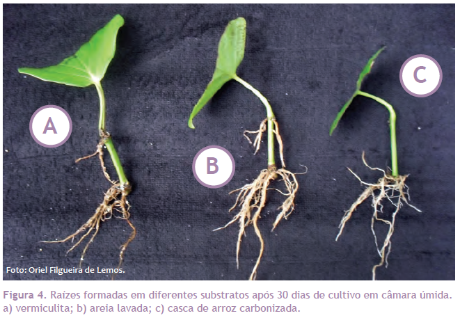 Se a folha for grande, é recomendado reduzir o tamanho pela metade, para diminuir a transpiração. As mudas devem permanecer durante 20 a 30 dias nos propagadores e, quando as estacas começarem a brotar, é feito o transplantio para sacolas, nas quais devem permanecer por aproximadamente 30 dias (Figura 4).