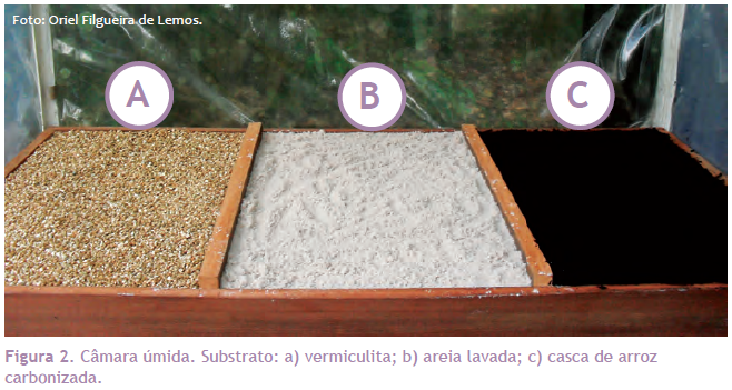 As estacas são enraizadas em propagadores em forma de canteiros, utilizando substrato de areia branca, casca de arroz carbonizada ou vermiculita (Figura 2).