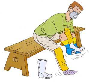 Impermeáveis, devem ser calçadas sobre meias de algodão de cano longo, para evitar atrito com os pés, tornozelos e canela. As bocas da calça do EPI sempre devem estar para fora do cano das botas, a fim de impedir o escorrimento do produto tóxico para o interior do calçado.
