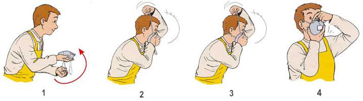 Deve ser colocado de forma que os dois elásticos fiquem fixados corretamente e sem dobras, um fixado na parte superior da cabeça e outro na parte inferior, na altura do pescoço, sem apertar as orelhas. O respirador deve encaixar perfeitamente na face do trabalhador, não permitindo que haja abertura para a entrada de partículas, névoas ou vapores. Para usar o respirador, o trabalhador deve estar sempre bem barbeado.