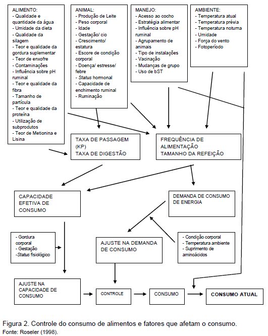 Roseler (1998) chama a atenção para a importância relativa dos fatores que afetam a IMS em vacas em lactação (Figura 3). Os principais fatores que afetam o consumo voluntário são o nível de produção (45%), os alimentos utilizados e o manejo adotado (22%), o peso corporal (17%), o ambiente (10%) e a condição corporal (6%).