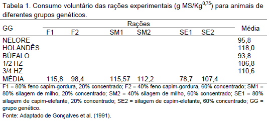 Nos bovinos, alguns autores já encontraram um maior consumo voluntário em Holandeses, quando comparados com mestiços zebuínos. A Tabela 1 mostra os resultados de consumo voluntário de animais de diferentes grupos genéticos, expressos em g MS/kg de peso metabólico.