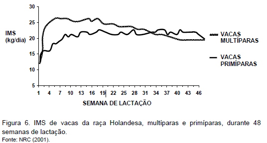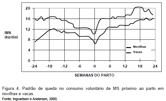 Em vacas leiteiras, há queda no consumo ao parto por interferência do balanço hormonal e da mobilização de gordura corporal. Nesse período, a capacidade de ingestão aumenta menos rapidamente do que as necessidades energéticas e de nutrientes, o que caracteriza o balanço energético negativo. Em vacas recebendo dietas com composição constante, o pico de produção de leite ocorre entre a quinta e a sétima semana pós-parto, enquanto o pico de consumo só é atingido entre a oitava e a 22ª semana. O consumo voluntário de MS é mais alto em vacas multíparas do que em primíparas (Figura 4). A capacidade de consumo em vacas primíparas com dois anos de idade, próximo ao parto, é ao redor de 80% do consumo voluntário observado em vacas multíparas. Além disso, o pico de consumo é mais tardio e a IMS aumenta mais lentamente em primíparas do que em vacas multíparas.