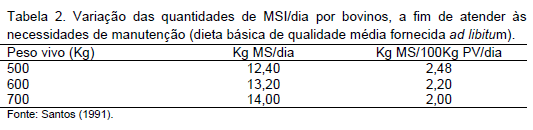 Para animais de mesmo tipo, a quantidade de matéria seca ingerida por dia (MSI/dia) eleva-se com o aumento do PV. Essa elevação no consumo resulta do aumento das necessidades energéticas e é permitida graças ao aumento da capacidade do estômago. Entretanto, com relação aos 100Kg PV, a quantidade de MSI diminui, como pode ser visto na Tabela 2.
