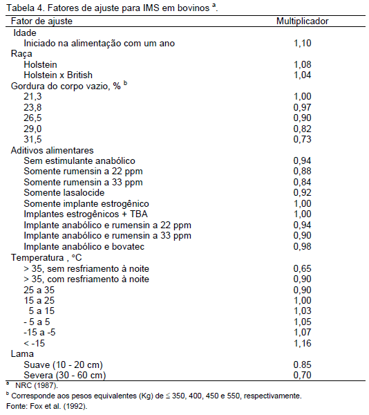 O Sistema de Proteína e Energia Líquida de Cornell para bovinos - CNCPS (Fox et al., 1992) propõe fatores de correção para a IMS, conforme pode ser visto na Tabela 4 a seguir. Para animais em pastejo, o modelo ajusta a IMS em função da disponibilidade de forragem por unidade de área e da proporção de forragem disponível por animal por dia em relação ao potencial de ingestão de forragem do animal. Nessa tabela, pode-se verificar o efeito de diferentes fatores sobre o consumo, mas, ao utilizá-la, deve-se ter o cuidado de não se contraporem valores, pois muitas vezes pode-se estar diante da necessidade de várias correções. Esta é a principal crítica que o NRC (2001) faz a esta tabela. O CNCPS assume um consumo máximo de FDN ao parto de 0,8% do PV e de 1,2% do PV no período de 100 dias pós-parto a 160 dias de gestação.