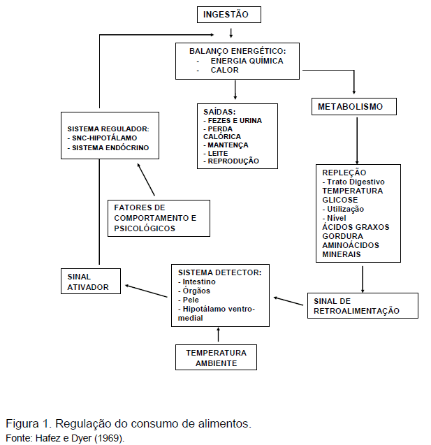 Nos monogástricos, a elevação progressiva da taxa de glicose sanguínea age sobre o centro da saciedade. Esse mecanismo de controle é chamado glicostático. Nos ruminantes, tal informação é dada pelos ácidos graxos voláteis, que são absorvidos pela parede ruminal. A maior parte dos trabalhos tem demonstrado que o acetato parece ser o ácido graxo volátil mais envolvido nesta regulação. Entretanto, pesquisas mais recentes apontam para uma forte participação do propionato. Sabe-se que alguns neurotransmissores também estão envolvidos com o comportamento alimentar dos animais, como a epinefrina e a norepinefrina, que parecem aumentar a ingestão, e a serotonina e o carbacol, que parecem reduzir o consumo. A colecistoquinina também pode atuar na redução do consumo de bovinos, assim como o glucagon, que parece intervir aumentando a ingestão voluntária. Alguns opioides de ação central também parecem atuar no SNC, alterando o consumo.