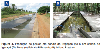 - Viveiros e barragens com renovação de água (Figuras 3A e B) - A renovação pode ser constante ou intermitente, suportando uma densidade de estocagem maior (10 a 30 t/ha) que aquelas do sistema estático. Essa possibilidade de utilizar maior estocagem é resultado da renovação de água no sistema, que permite uma diminuição na concentração de resíduos provenientes da ração e do metabolismo dos peixes, com menor probabilidade de eutrofização da água de cultivo. Entretanto, nessa estrutura, pode ser necessário o uso de aeradores.
