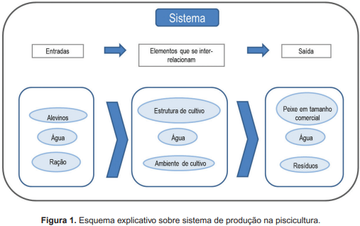 A definição de sistema de produção é extremamente ampla e pode ser utilizada para diversas áreas de conhecimento, como ciências agrárias e engenharia. Um sistema de produção pode ser entendido como um conjunto de elementos que se interrelacionam com o objetivo de transformar entradas (insumos) em saídas (produtos), através de um processo pré-definido (sistema de produção). Fazendo um paralelo com a piscicultura, seria um conjunto de fatores ou elementos (infraestrutura, água, meio ambiente) que são manejados para transformar entradas (água, peixes, adubos, ração) em saídas (peixes de tamanho comercial, resíduos e água de descarte). Esses sistemas variam de acordo com a infraestrutura utilizada, a dependência dos animais em relação à ração ofertada, a densidade de cultivo, o manejo despendido, entre outros aspectos (Figura 1).