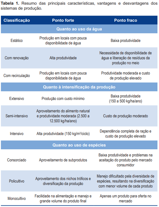 Os sistemas de produção aquícolas podem ser classificados (1) quanto ao uso da água, (2) quanto à intensificação da produção ou (3) quanto à utilização das espécies. A seguir, cada uma dessas classificações dos sistemas de produção é descrita detalhadamente.
