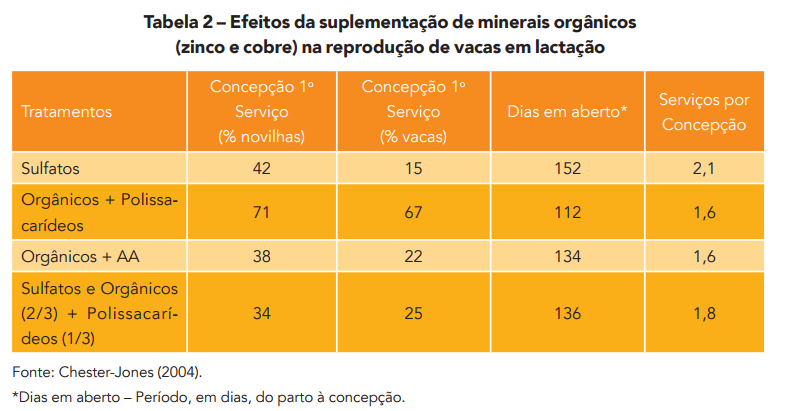 Chester-Jones (2004) comparou minerais orgânicos conjugados com aminoácidos e minerais orgânicos conjugados com polissacarídeos. Além disso, incluiu, no tratamento, uma mistura entre sulfatos e minerais orgânicos conjugados a polissacarídeos (2/3 e 1/3, respectivamente) e um tratamento com minerais inorgânicos somente. Os resultados constam da Tabela 2.