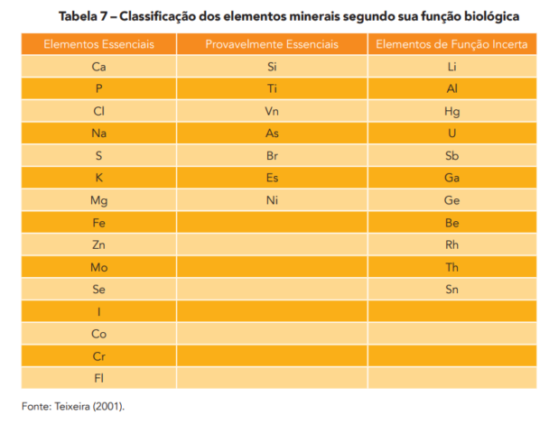 A classificação dos minerais também pode ser feita com base em suas funções, como as biológicas, que determinam a sua essencialidade. Teixeira (2001), classifica os elementos minerais como sendo: essenciais, provavelmente essenciais e elementos de função incerta.