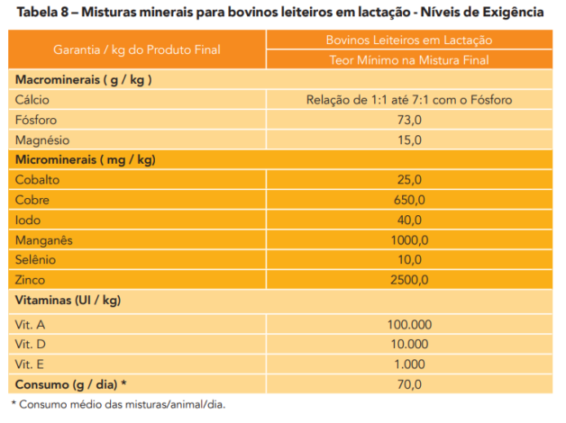 A suplementação mineral em gado leiteiro de média e alta produção tem foco na melhora do desempenho reprodutivo, que consiste na diminuição do intervalo de partos, diminuição dos serviços por concepção e aumento na proporção de vacas prenhes em relação ao rebanho. Outro ponto em que a suplementação mineral exerce efeito é na qualidade do leite, principalmente na contagem de células somáticas (CCS), índice usado para medir o grau de infecção da glândula mamária. As células somáticas presentes na matéria-prima, segundo Fonseca e Santos (2000), ocorrem pelo aumento do número de leucócitos advindos de vacas contaminadas com uma infecção bacteriana nos úberes, denominada “mastite ou mamite”. Como consequência de altos níveis de células somáticas, observam-se prejuízos tanto ao produtor de leite quanto à indústria de laticínios e, segundo Santos (2002), as maiores perdas causadas ao produtor estão relacionadas à redução da produção. Consequentemente, esta redução gera problemas de captação da matéria-prima para a indústria. A suplementação efetiva de vitamina e alguns microminerais (zinco) têm efeito positivo na CCS.