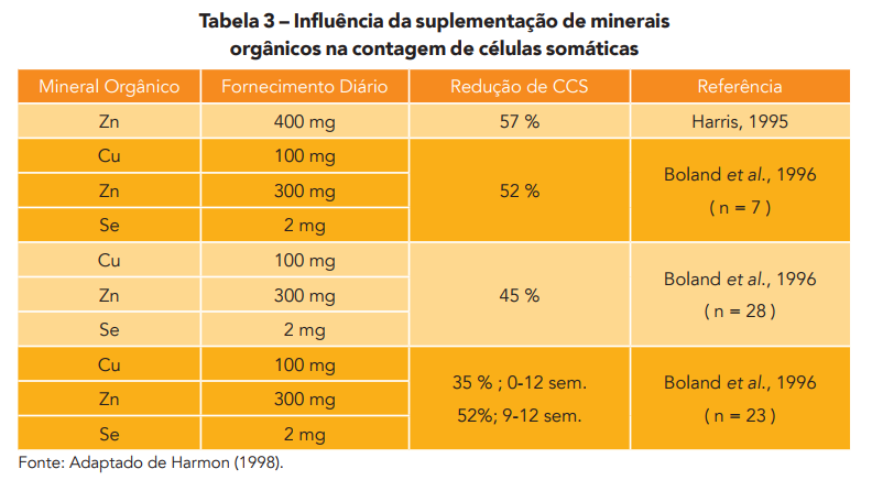 Em levantamento feito por Harmon (1998), foi observada redução da CCS em intensidades diferentes, com suplementação orgânica envolvendo zinco, cobre e selênio.