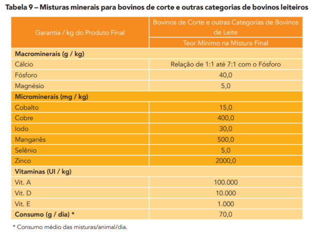 De acordo com o Ministério da Agricultura, Pecuária e Abastecimento (MAPA), alguns requisitos básicos devem ser atendidos para regulamentação das misturas minerais, como se pode observar nas Tabelas seguintes.