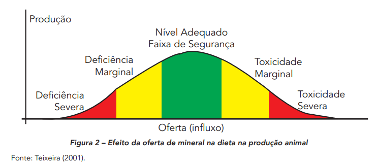 A Figura 2 ilustra a oferta de um determinado elemento mineral e seu efeito na produção. Este conceito é valido para todos os elementos minerais e o nutricionista deve estar sempre em busca do nível adequado do mineral na dieta, isto é, do nível ou da faixa de segurança.