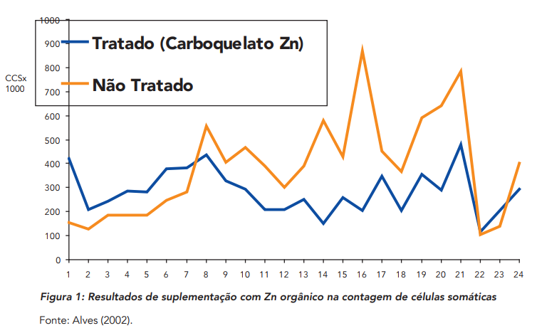 Alves (2002), trabalhando com vacas holandesas em regime de free-stall, avaliou o desempenho em relação à contagem de células somáticas (CCS) durante 1 ano, com os resultados mensurados a cada 15 dias. Observou menor contagem em animais suplementados com zinco orgânico.