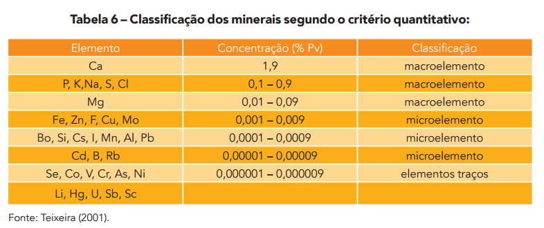 A classificação dos minerais, segundo o critério quantitativo, pode ser dividida em macroelementos, microelementos e elementos traços (TEIXEIRA, 2001). Deve-se ressaltar que esta classificação é meramente quantitativa, ou seja, refere-se apenas à concentração do mineral no organismo, desconsiderando, portanto, neste caso, qualquer outro tipo de classificação.