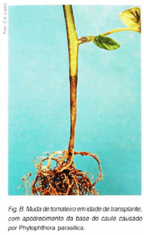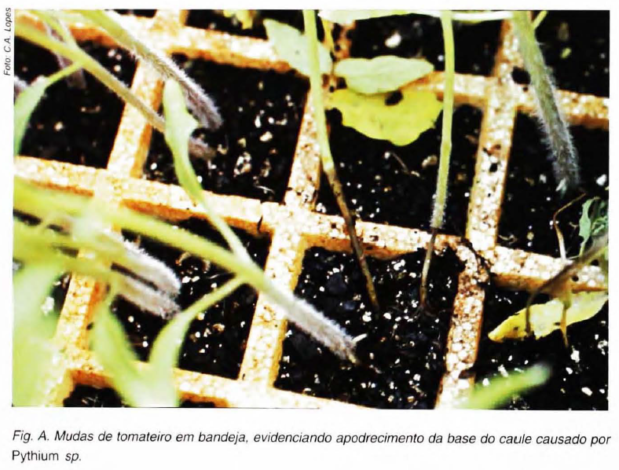Na produção de mudas em bandejas. com substrato esterilizado, a doença só ocorrerá nessa fase se o manejo for inadequado, principalmente por irrigação excessiva ou com água contaminada.