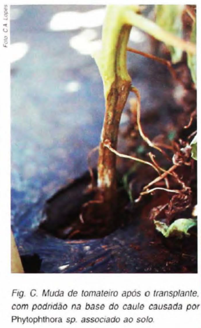 Podem ocorrer falhas de estande (tombamento em pré-emergência) ou morte das plântulas pelo apodrecimento e estreitamento da base do caule (tombamento em pós-emergência), antes (Figura B) ou após o transplante (Figura C).