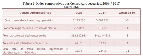 Os dados comparativos dos censos agropecuários do Brasil, coletados em um intervalo de onze anos (2006-2017), mostra um panorama claro. O número de produtores sem área de plantio em 2017 é alentador, visto que houve uma redução de 30% do número daqueles que não possuem acesso à terra. Em outra direção de análise, apesar do número de estabelecimentos agropecuários presentes no território brasileiro ter praticamente se mantido nesse período (com somente 3% de redução) e da área total de estabelecimentos em hectares também praticamente não ter se alterado (com 3% de incremento), sendo também mantida a área média desses estabelecimentos em hectare (apenas 1% de aumento), houve um vertiginoso crescimento de 71% na safra total brasileira de grãos, cereais, leguminosas e oleaginosas, em milhões de toneladas.