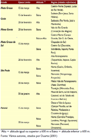 Considerando a inviabilidade de antever a interação genótipo e ambiente e suas variações de combinações, as épocas-limites preferencialmente recomendadas para a semeadura, de acordo com vários trabalhos de pesquisa, encontram-se na Tabela 4.1. Em Mato Grosso, Goiás, Minas Gerais, norte de São Paulo e Mato Grosso do Sul, o principal fator de risco é o déficit hídrico, sendo atenuado nas áreas de maior altitude, em razão de as temperaturas amenas proporcionarem menor evapotranspiração.