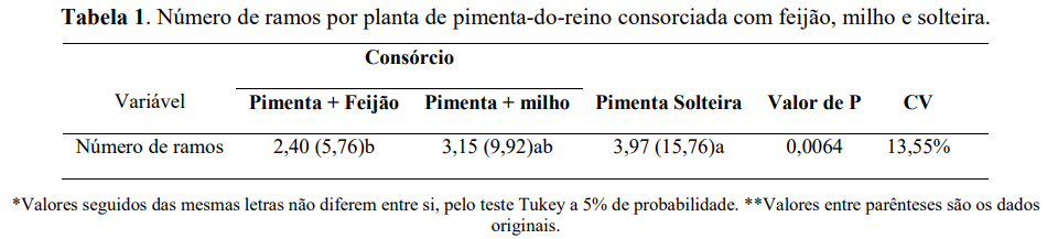 Ao comparar as ramificações da pimenta-do-reino nos diferentes consórcios (Tabela 1), tem-se uma maior ramificação na pimenteira solteira, sendo reduzidos com o cultivo consorciado de milho e feijão, assim, os consórcios prejudicam as ramificações da planta, não propiciando uma boa formação da estrutura da base da pimenteira.