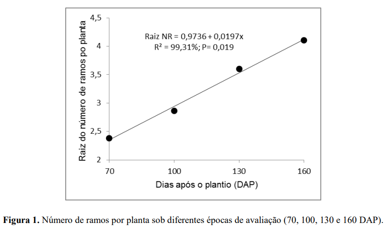 A variável, número de ramos por planta por não atender aos pressupostos da análise de variância, foi transformada em sua raiz quadrada e apresentada na análise de regressão e no teste Tukey. Como não houve interação (P<0,05) entre o tratamento na subparcela “épocas de avaliação” e na parcela “consócios”, os resultados foram discutidos isoladamente.