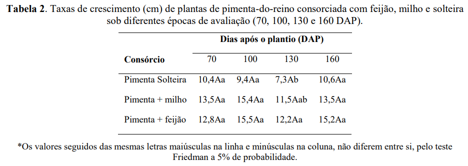 Embora a altura das plantas tenham sido diferente entre si, as taxas de crescimento não seguiram esse mesmo padrão, como pode ser observado na tabela 2, as taxas de crescimento se apresentaram estatisticamente iguais aos 70, 100 e 160 dias após plantio (DAP) da pimenta-do-reino entre os diferentes sistemas de cultivo, diferindose apenas aos 130 DAP, onde a maior taxa de crescimento foi no consorciamento com milho. Aos 130 DAP, o milho com 90 dias de germinação fornecia o máximo de sombreamento, influenciando no estiolamento da pimenta-do-reino, provavelmente por isso a pimenta apresentou maior taxa de crescimento neste período, uma vez que as médias de alturas do consorciamento com milho mantiveram-se menores que aquelas com feijão.
