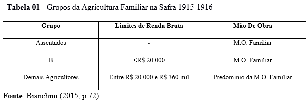 Conforme pode ser verificado na Tabela 01 é constituído três grupos na agricultura familiar para diferenciar o acesso as políticas públicas direcionadas para esse setor. Os grupos são diferenciados considerando a renda bruta e a mão de obra utilizada nas atividades desenvolvidas na propriedade.