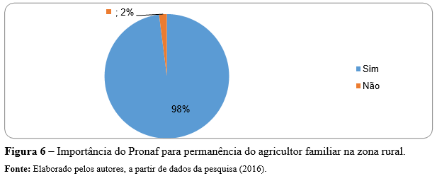 A indagação central deste trabalho é verificar se o Pronaf é um programa que consegue atenuar as dificuldades encontradas pelos agricultores familiares em permanecer no espaço rural proporcionando a melhoria das estruturas de produção gerando renda e, como consequência, melhores condições de vida no campo. Na Figura 6 é possível verificar, na perspectiva dos entrevistados, a relevância do Pronaf na permanência do agricultor familiar em suas propriedades.