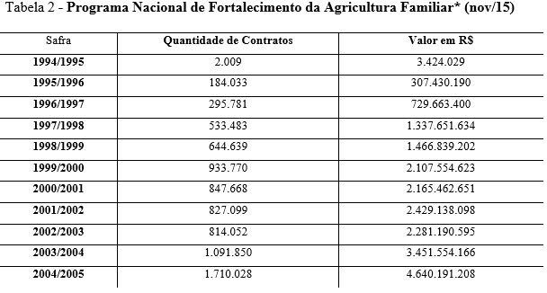 Conforme apresentado na Tabela 2, desde 1995, quando iniciou o programa do Pronaf, houve uma constância no crescimento do número de contratos bem dos valores operacionalizados. Todavia, a partir da safra 2013/2014, mesmo com a crescente no volume operado, houve uma queda no número de contratos, demonstrando uma concentração do crédito e o atendimento a um menor número de agricultores familiares. Essa concentração do valor do Pronaf para uma parcela menor de agricultores é concretizada ao comparar o valor médiopor contrato operacionalizado na safra 2013/2014 que foi de R$ 8.702,67 com a safra 2014/2015 chegando ao valor médio de R$ 12.618,36.